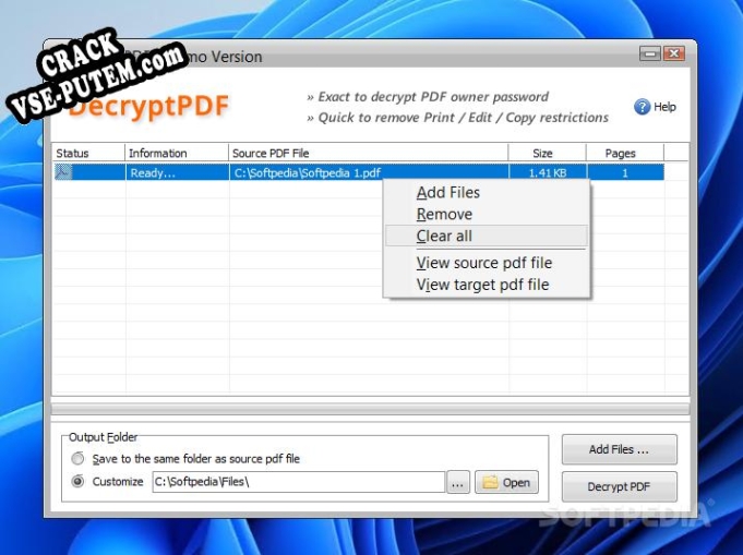 На этой странице вы можете скачать crack для DecryptPDF. Сам ключ будет уникальным, и послужит только для активации программы.