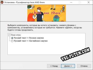 Приветсвуем на Vse-Putem.COM! Если вы зашли на эту страницу, вы скорее всего искали рабочий русификатор here AND there. Здесь вы можете скачать русификатор для версии игры 1.0 и выше. Этот русификатор от Drag Team будет работать и на более поздних версиях.