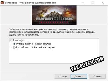 Приветствуем вас на страницах нашего сайта Vse-Putem.COM, где вы найдете все необходимые русификаторы для своих любимых игр! Если вы хотите играть в Warfront Defenders на русском языке, то вы попали по адресу! Русификатор позволит вам перевести игру. Достуен русификатор от BetaMaster, в ближайшее время мы постараемся добавить больше файлов для этой игры!