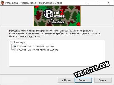 Приветсвуем на Vse-Putem.COM! Если вы зашли на эту страницу, вы наверняка искали русификатор для Pixel Puzzles 2 Christmas. Здесь вы можете скачать русификатор для версии игры 1.0 и выше. На данный момент доступен русификатор от Dr.XJ.