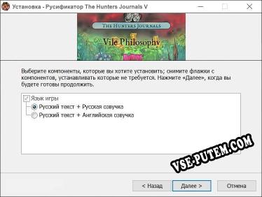 Добро пожаловать на наш сайт Vse-Putem.COM! Если вы зашли на эту страницу, вы скорее всего искали рабочий русификатор The Hunters Journals Vile Philosophy. Русификатор позволит вам перевести игру. Более подробная информация, а также ссылка на скачивание, ниже.