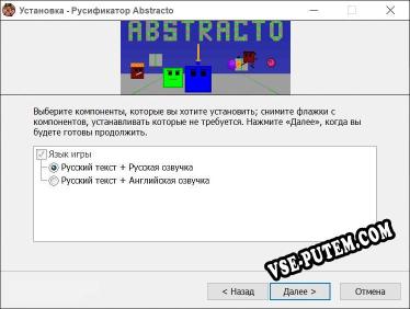 Добро пожаловать на наш сайт Vse-Putem.COM! Наш русификатор обеспечит качественный перевод игры на русский язык и поможет вам получить удовольствие от игры Abstracto на полную. У нас вы найдете только качественный русификатор, гарантирующий работу игры без сбоев. Здесь вы можете скачать русификатор для версии игры 1.0 и выше. Достуен русификатор от ADMINCRACK, в ближайшее время мы постараемся добавить больше файлов для этой игры!