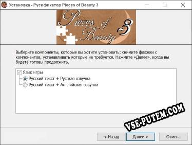 Добро пожаловать на наш сайт Vse-Putem.COM! Если вы искали актуальный и рабочий русификатор для Pieces of Beauty 3, вы попали в правильное место. Здесь вы можете скачать русификатор для версии игры 1.0 и выше. Достуен русификатор от GZKS, в ближайшее время мы постараемся добавить больше файлов для этой игры!